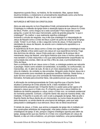 1) O documento discute a Cristologia, a doutrina cristã sobre Jesus Cristo, e como ela deve partir tanto da perspectiva histórica de Jesus quanto da revelação de Deus.