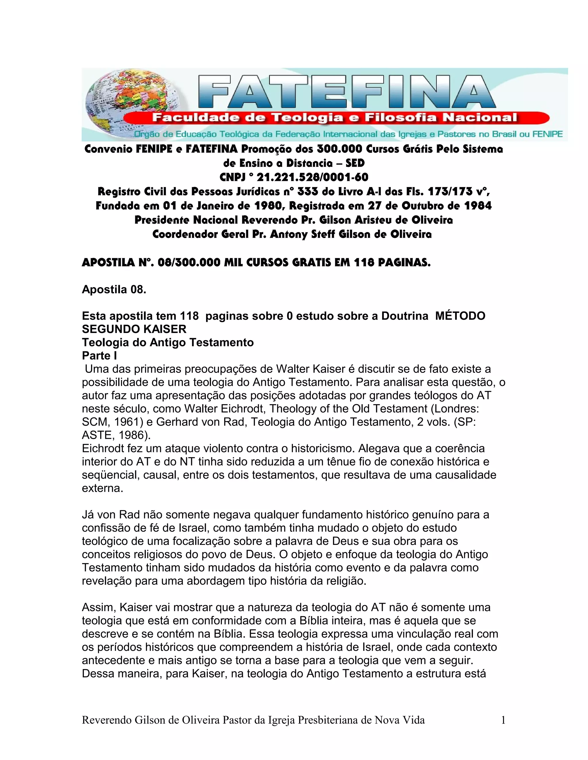 Este documento discute o método teológico de Walter Kaiser para a teologia do Antigo Testamento. Ele argumenta que a teologia do AT deve ser baseada no texto bíblico e não em material extra-bíblico. Kaiser também defende a existência de um centro canônico unificado no AT e aborda questões como o que motiva a teologia do AT.