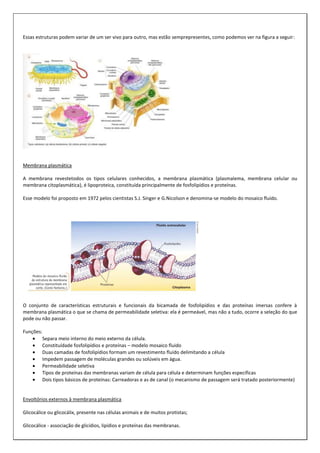 O documento fornece informações sobre células, incluindo sua estrutura básica, tipos de transporte através da membrana plasmática e a estrutura da própria membrana plasmática. Ele também discute estruturas externas à membrana como o glicocálice e a parede celular, e fornece exemplos de exercícios sobre esses tópicos.