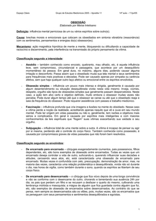 O documento define obsessão como a influência mental perniciosa de um ou mais espíritos sobre outro, discute suas causas e classificações. A prevenção envolve cultivar pensamentos e sentimentos positivos para manter uma frequência vibratória elevada, e o tratamento pode requerer limpeza energética e mudança de padrão mental com a ajuda espiritual.