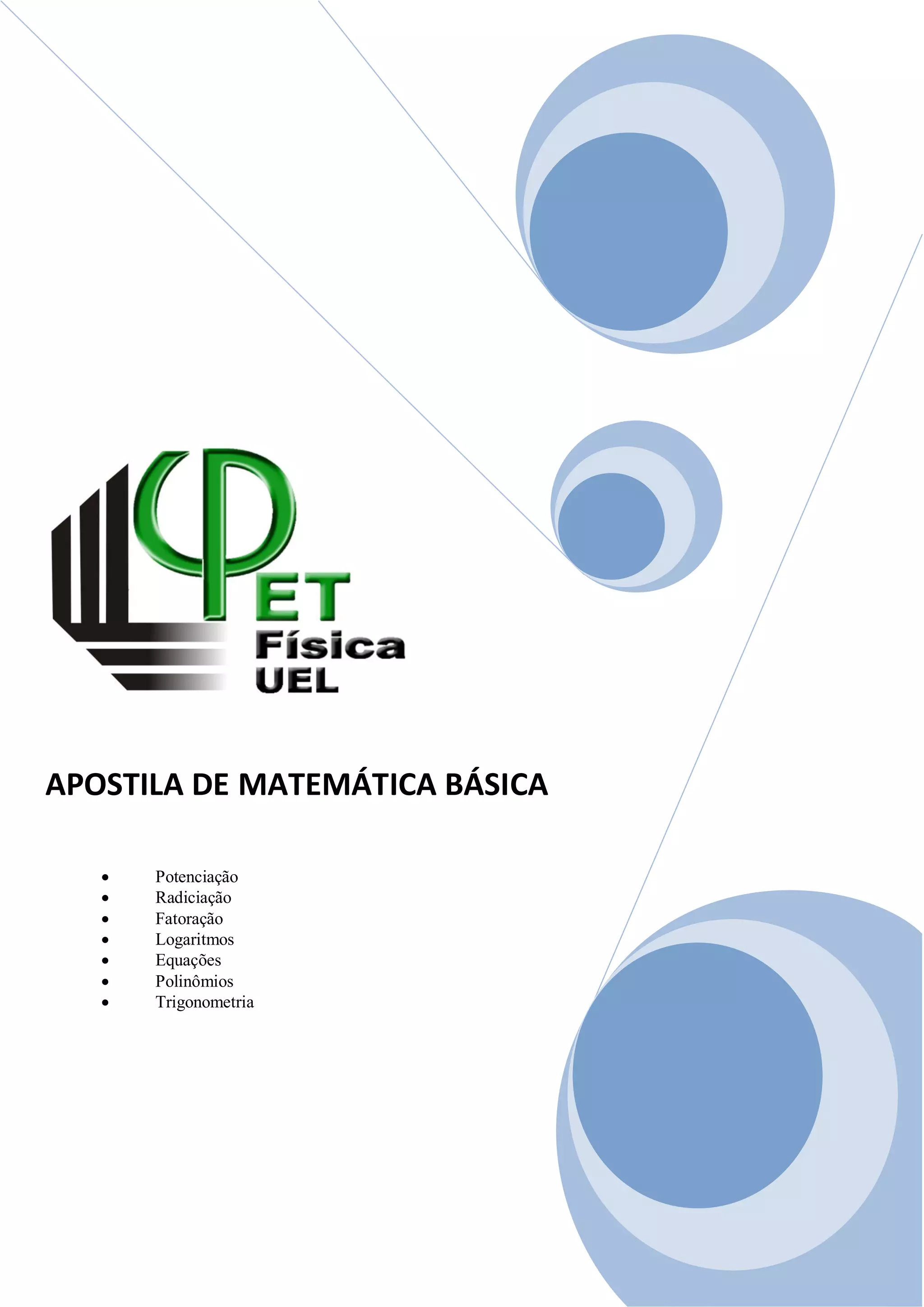 Este documento apresenta uma apostila básica de matemática, abordando os seguintes tópicos: potenciação, radiciação, fatoração, logaritmos, equações, polinômios e trigonometria. As principais propriedades e conceitos de cada tópico são explicados de forma passo a passo com exemplos ilustrativos.