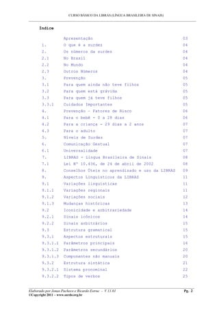 Este documento fornece um curso básico sobre a Língua Brasileira de Sinais (Libras). Ele discute o que é surdez, números sobre surdez no Brasil e no mundo, prevenção de surdez, fatores de risco, níveis de surdez, comunicação gestual, aspectos linguísticos da Libras e ensina sinais básicos.