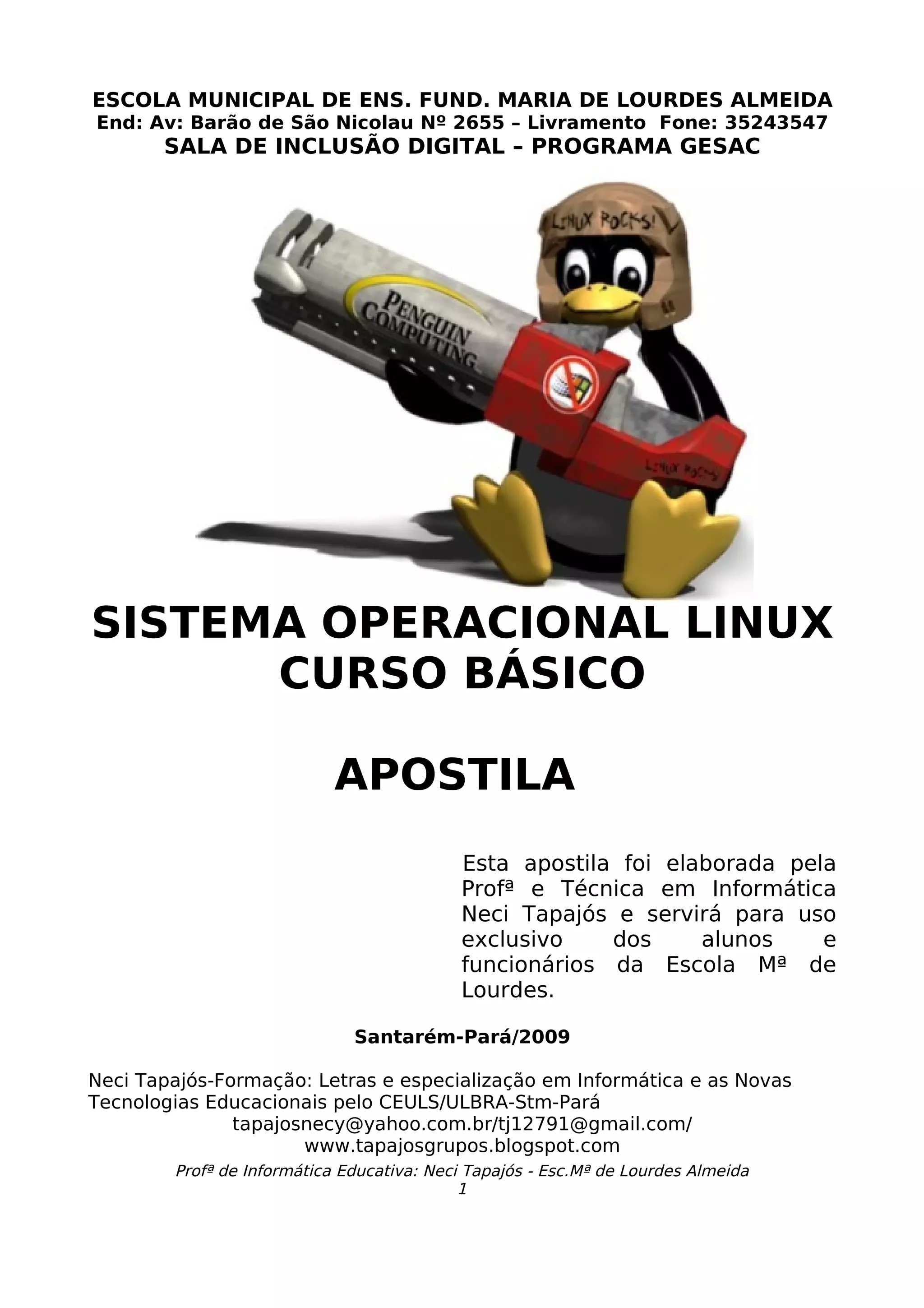Este documento fornece instruções sobre como usar o sistema operacional Linux, incluindo uma introdução ao Linux, componentes de hardware, unidades de medida, tipos de memória, teclas do teclado, como criar pastas e usar softwares como o LibreOffice Writer.