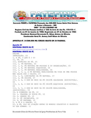 Este documento descreve um acordo entre duas organizações, FENIPE e FATEFINA, para fornecer 300.000 cursos gratuitos online. O documento lista os detalhes da parceria, incluindo os nomes e cargos dos líderes das organizações, e fornece uma introdução sobre fé cristã e suas diferentes formas.