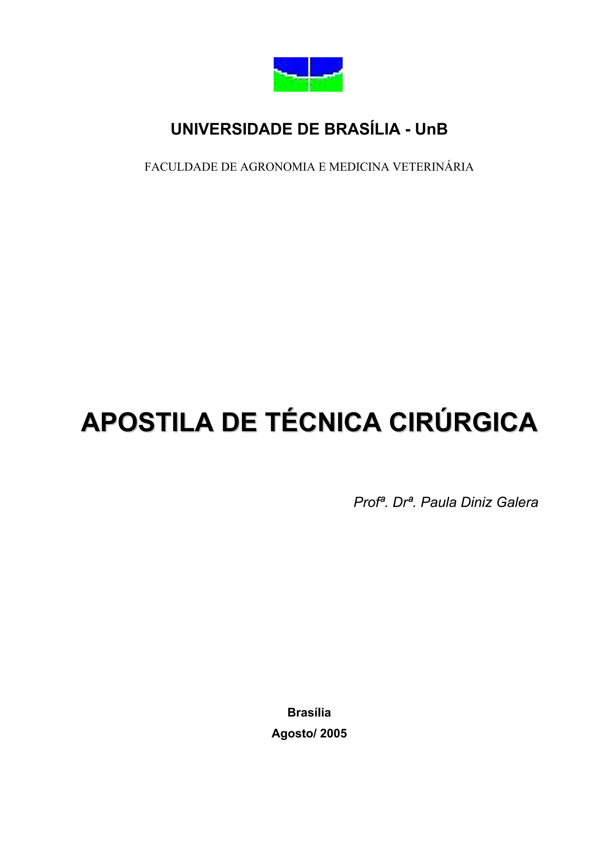 [1] O documento apresenta uma apostila sobre técnica cirúrgica veterinária ministrada na Universidade de Brasília, [2] contendo informações sobre objetivos, ementa, descrição do programa, metodologia e critérios de avaliação da disciplina, [3] além de detalhar diversas técnicas cirúrgicas aplicadas a pequenos animais e incluir referências bibliográficas.