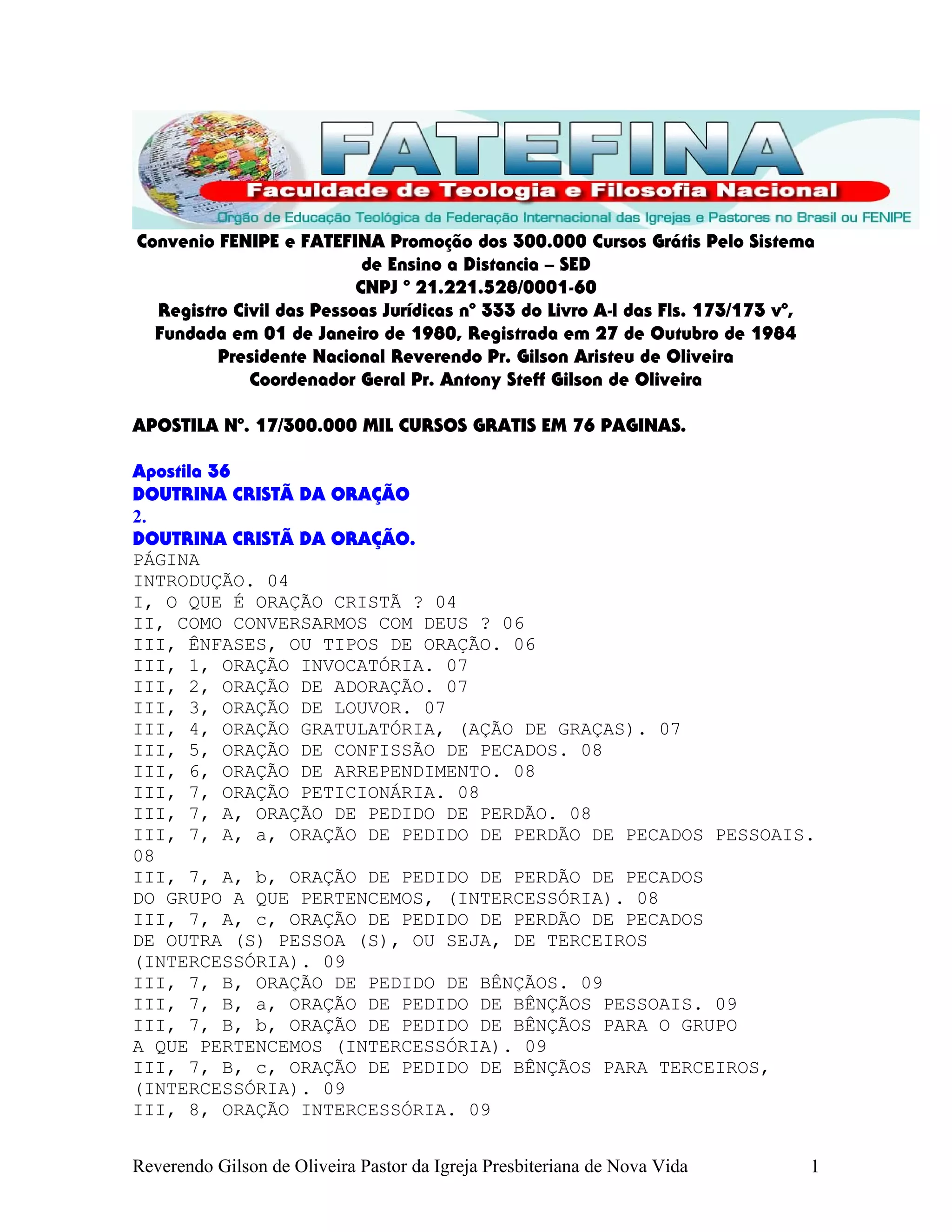 [1] O documento discute a doutrina cristã da oração, definindo-a como uma conversa com Deus. [2] Ele lista e explica diferentes tipos de oração como adoração, louvor, ação de graças, confissão de pecados e petição. [3] Também discute como, onde e quando a oração pode ser realizada de acordo com a vontade de Deus.