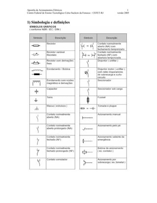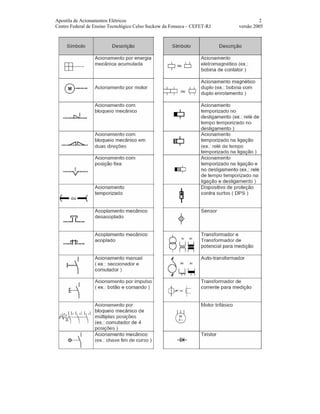 O documento descreve os principais componentes de acionamentos elétricos, incluindo seccionadores, interruptores, contatores, disjuntores, relés térmicos e fusíveis. Detalha o funcionamento e objetivo de cada componente no sistema elétrico. Também fornece exemplos de sistemas completos e dados sobre motores elétricos.