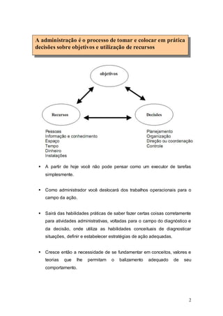 O documento discute os conceitos fundamentais da administração, incluindo as definições de administração, as teorias clássicas da administração de Taylor e Fayol, e os princípios da administração científica de Taylor, como planejamento, preparação de trabalhadores, controle e execução.
