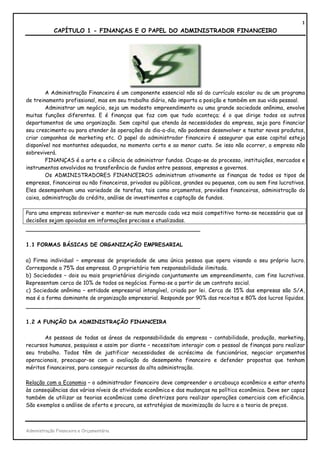 1) O documento discute as funções e responsabilidades do administrador financeiro, incluindo planejamento financeiro, tomada de decisões de investimento e financiamento, e objetivos como maximizar a riqueza dos acionistas.