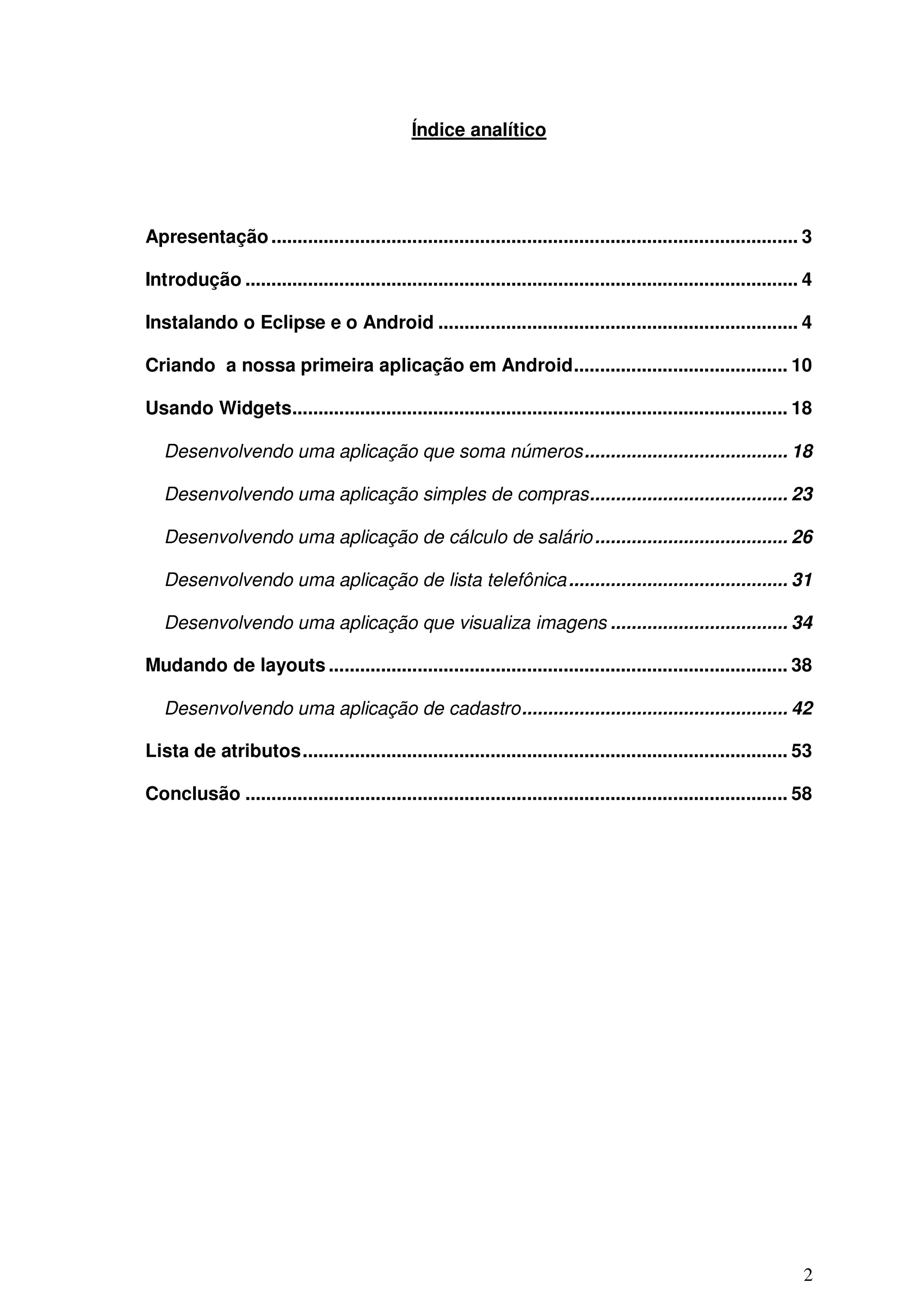 Este documento fornece instruções passo-a-passo para desenvolver aplicativos para Android usando o Eclipse. Ele explica como instalar o Eclipse, o SDK do Android e o plugin do Android, e criar um projeto simples "Hello World" para começar. Também descreve a estrutura básica de um projeto Android e como executar a aplicação no emulador.