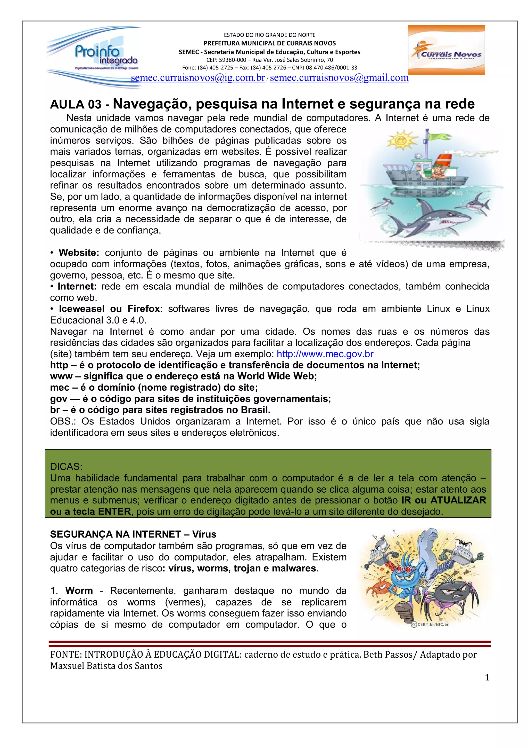 O documento fornece instruções sobre navegação na Internet, pesquisa online, segurança digital e criação de hipertextos. Ensina como acessar sites, usar ferramentas de busca como o Google, identificar endereços web, e criar documentos digitais com links e arquivos salvos. Também discute riscos como vírus e dicas para uma navegação segura.