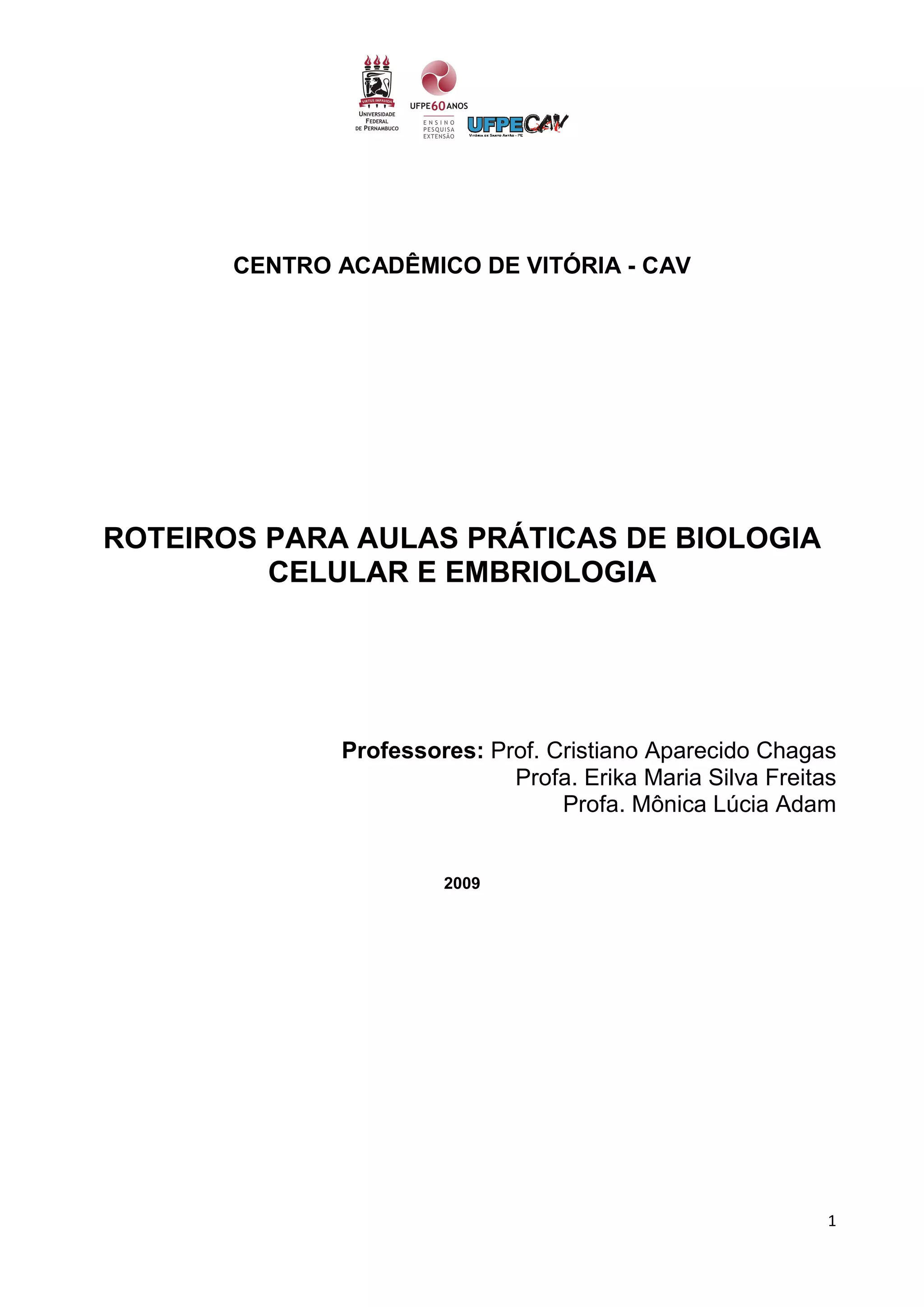 Este documento apresenta roteiros para aulas práticas de biologia celular e embriologia. Os roteiros incluem instruções para observação de estruturas celulares e tecidos ao microscópio óptico, como epitélios, tecido muscular e sistema nervoso central. As aulas abordam organelas celulares como retículo endoplasmático e citoesqueleto, além de junções intercelulares.