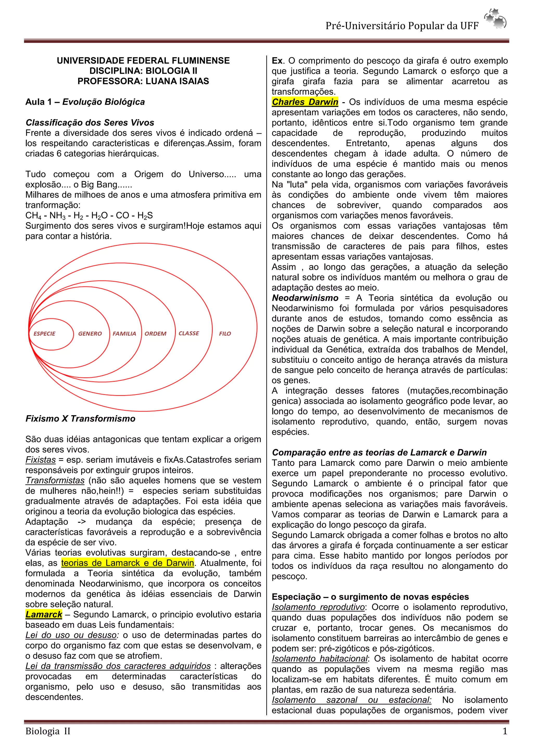 O documento resume os principais conceitos da evolução biológica e genética. Aborda as teorias de Lamarck e Darwin sobre a evolução, mecanismos de especiação como isolamento reprodutivo, e conceitos genéticos como gene, cromossomos homólogos e locus. Também discute formas de obtenção de energia pela célula como fermentação, respiração e fotossíntese.