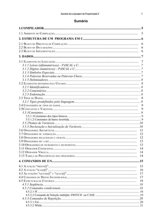 3. O documento serve como uma apostila básica sobre a linguagem C, cobrindo tópicos importantes para iniciantes na linguagem.