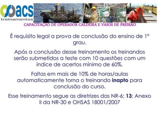 Este documento descreve um treinamento para operadores de caldeiras e vasos de pressão. O treinamento tem como objetivo instruir competências aos profissionais para que possam operar esses equipamentos de forma segura, protegendo suas vidas e o patrimônio das empresas. O treinamento aborda noções de grandezas físicas como pressão e temperatura e segue diretrizes de normas regulamentadoras. Após a conclusão, os treinandos farão um teste com questões para obtenção de certificado.