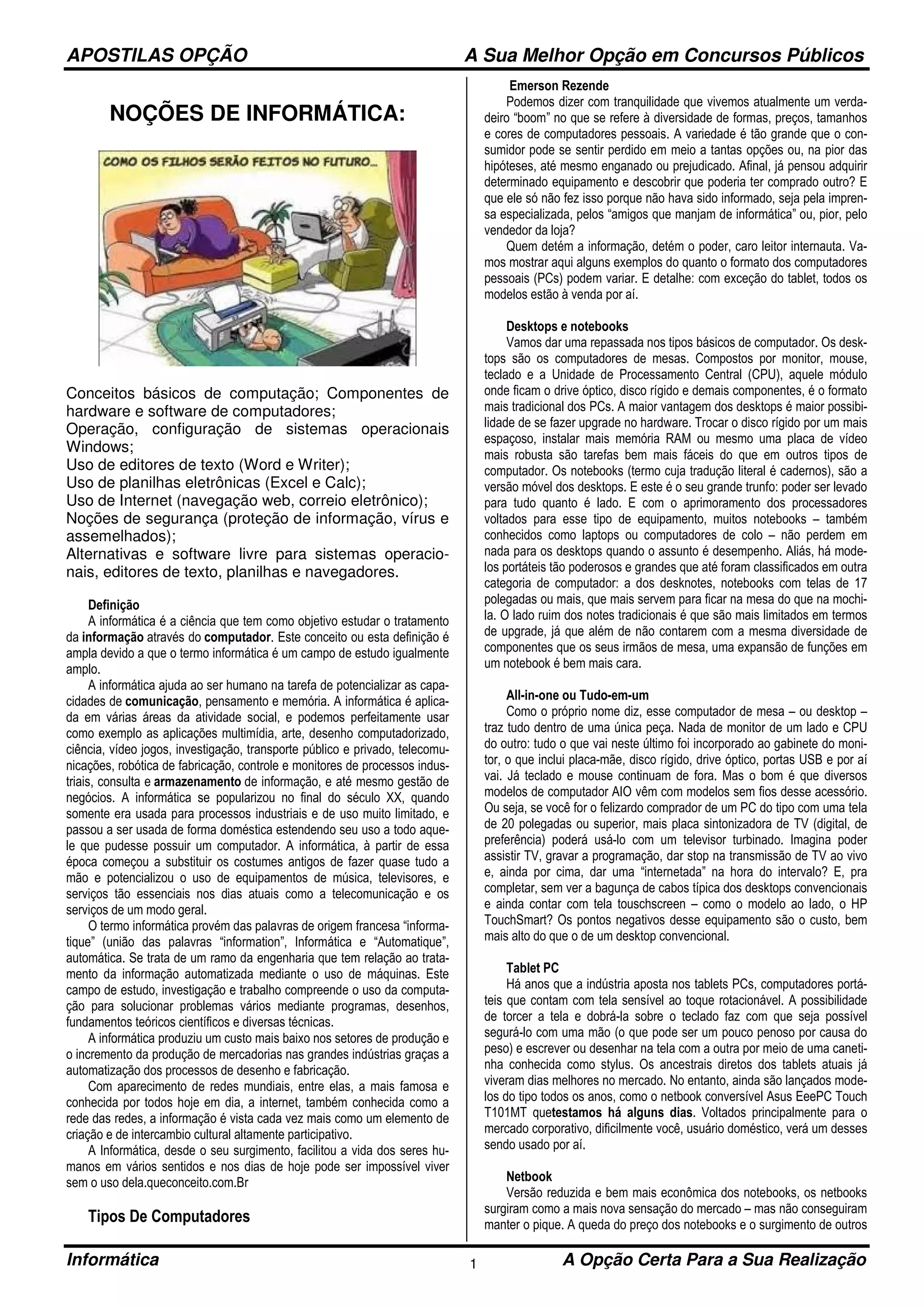 O documento discute conceitos básicos de informática, incluindo hardware, software, sistemas operacionais e aplicativos comuns. Também apresenta diferentes tipos de computadores como desktops, notebooks, all-in-one e tablets, destacando suas características e aplicações. Por fim, descreve dispositivos de entrada e saída como teclado, mouse, monitor e impressora.