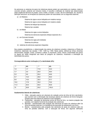 1) O documento descreve os diferentes tipos de coberturas, incluindo telhados, telhas e detalhes estruturais.