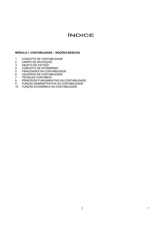 O documento apresenta um resumo sobre noções básicas de contabilidade para concursos públicos. Aborda conceitos como patrimônio, ativo, passivo e situação líquida. Explica as finalidades administrativa e econômica da contabilidade, assim como técnicas como escrituração e demonstrações financeiras.