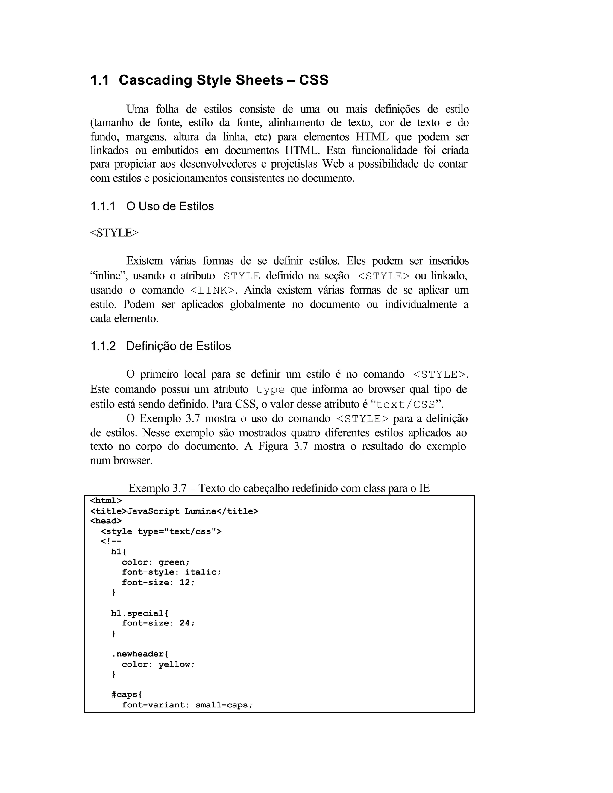 O documento descreve como usar folhas de estilo CSS (Cascading Style Sheets) para formatar elementos HTML. CSS permite definir estilos globais, por ID ou classe, e posicionar elementos em camadas usando propriedades como position, left, top e z-index.
