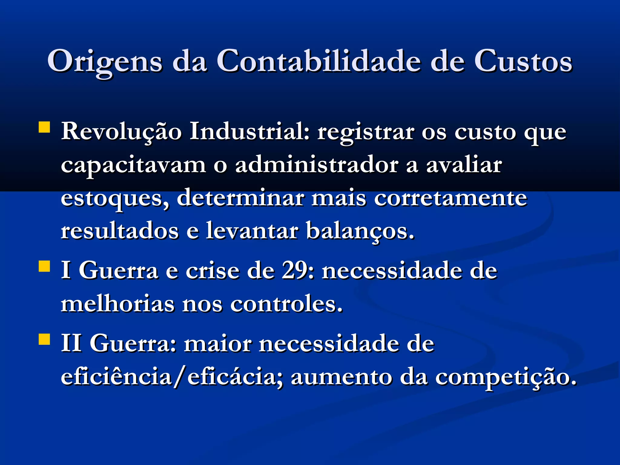 O documento descreve as origens e importância da contabilidade de custos ao longo da história. A contabilidade de custos surgiu durante a Revolução Industrial para registrar custos e melhorar a tomada de decisão de administradores. Guerras e crises econômicas também motivaram o desenvolvimento de melhores controles de custos. Atualmente, a gestão de custos é essencial para empresas devido à globalização e competição no mercado.