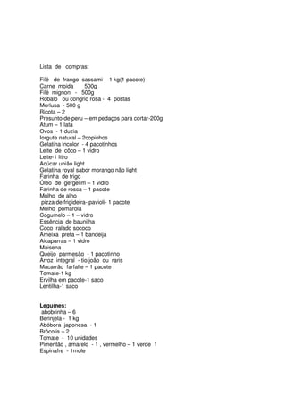 Uma apostila sobre dietas saudáveis contém receitas e dicas para refeições leves como rocambole de carne moída, filés de frango, peixe e lasanha de peixe. A lista de compras inclui itens como filé de frango, carne moída, legumes como abobrinha e berinjela e sobremesas diet como gelado de manga e maçã assada.