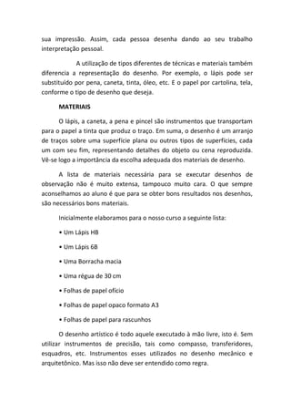 Este documento fornece instruções sobre técnicas de desenho de observação, incluindo materiais, composição, proporção, simetria e texturas. Ele explica como fazer esboços, delineamentos e como adicionar detalhes ao desenho observacional.