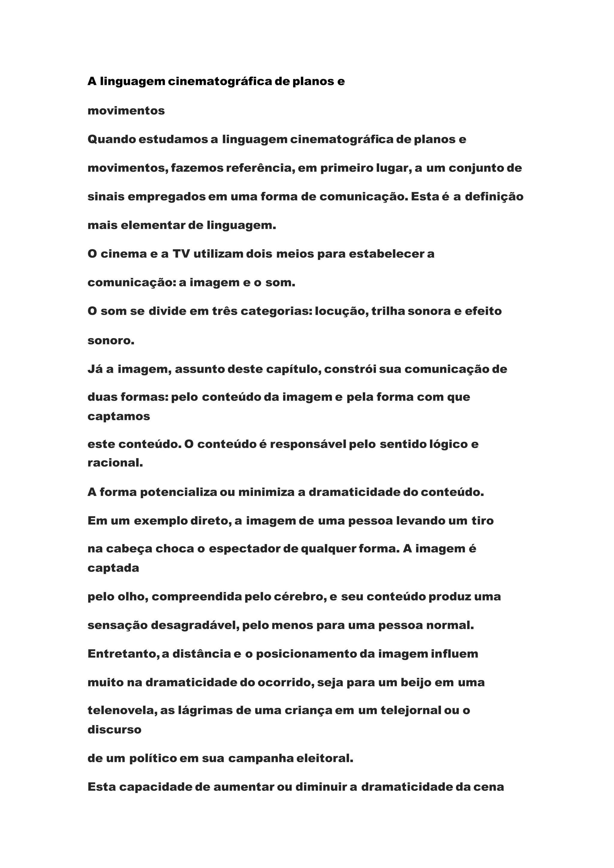 O documento discute os conceitos básicos da linguagem cinematográfica de planos e movimentos, definindo e explicando termos como plano geral, plano médio, close, travellings e panorâmicas. A distância dos planos estabelece a proximidade com o espectador e influencia a dramaticidade da cena.