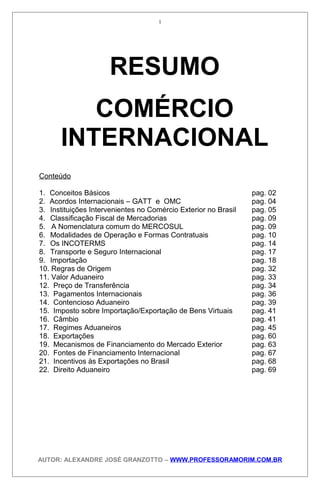 1. O documento discute conceitos básicos de comércio internacional e as instituições envolvidas no Brasil. 2. Aborda os acordos internacionais GATT e OMC, além das funções do Conselho Monetário Nacional, Câmara de Comércio Exterior e Banco Central. 3. Detalha as competências da Secretaria de Comércio Exterior no estabelecimento de políticas e emissão de documentos para importação e exportação.
