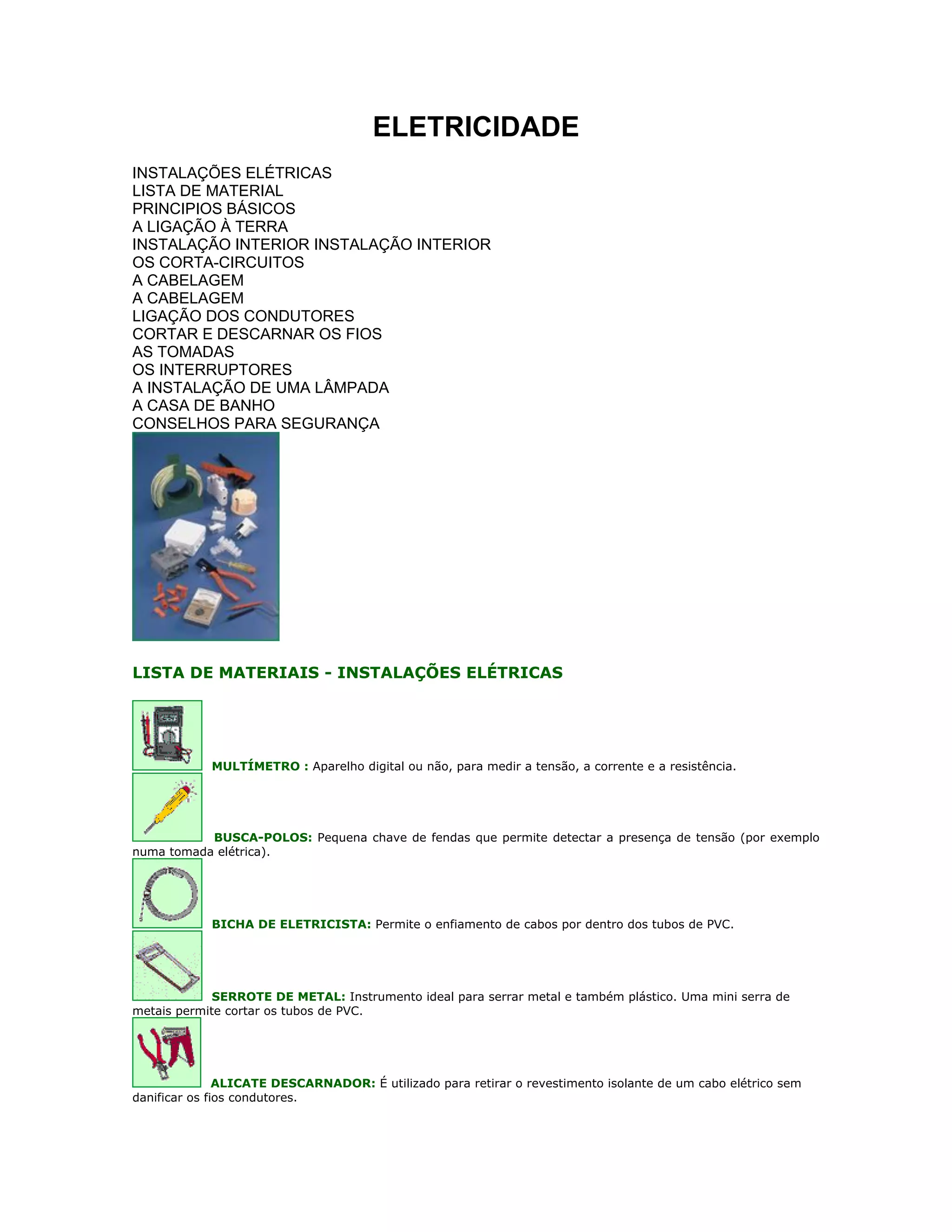 Este documento fornece instruções e listas de materiais para a instalação de sistemas elétricos residenciais. Explica os princípios básicos da eletricidade e fornece detalhes sobre aterramento, quadros elétricos, circuitos, fiação, proteção e segurança.