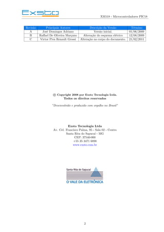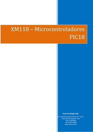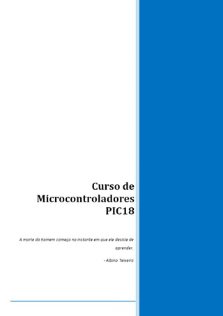 Este documento fornece uma introdução aos microcontroladores PIC18, descrevendo sua arquitetura, memória, periféricos e ferramentas de programação. Foi atualizado três vezes para alterar esquemas elétricos, corpo do documento e copyright. Ele resume os principais componentes e recursos dos PIC18 e fornece informações sobre como programá-los usando MPLAB e linguagem C.