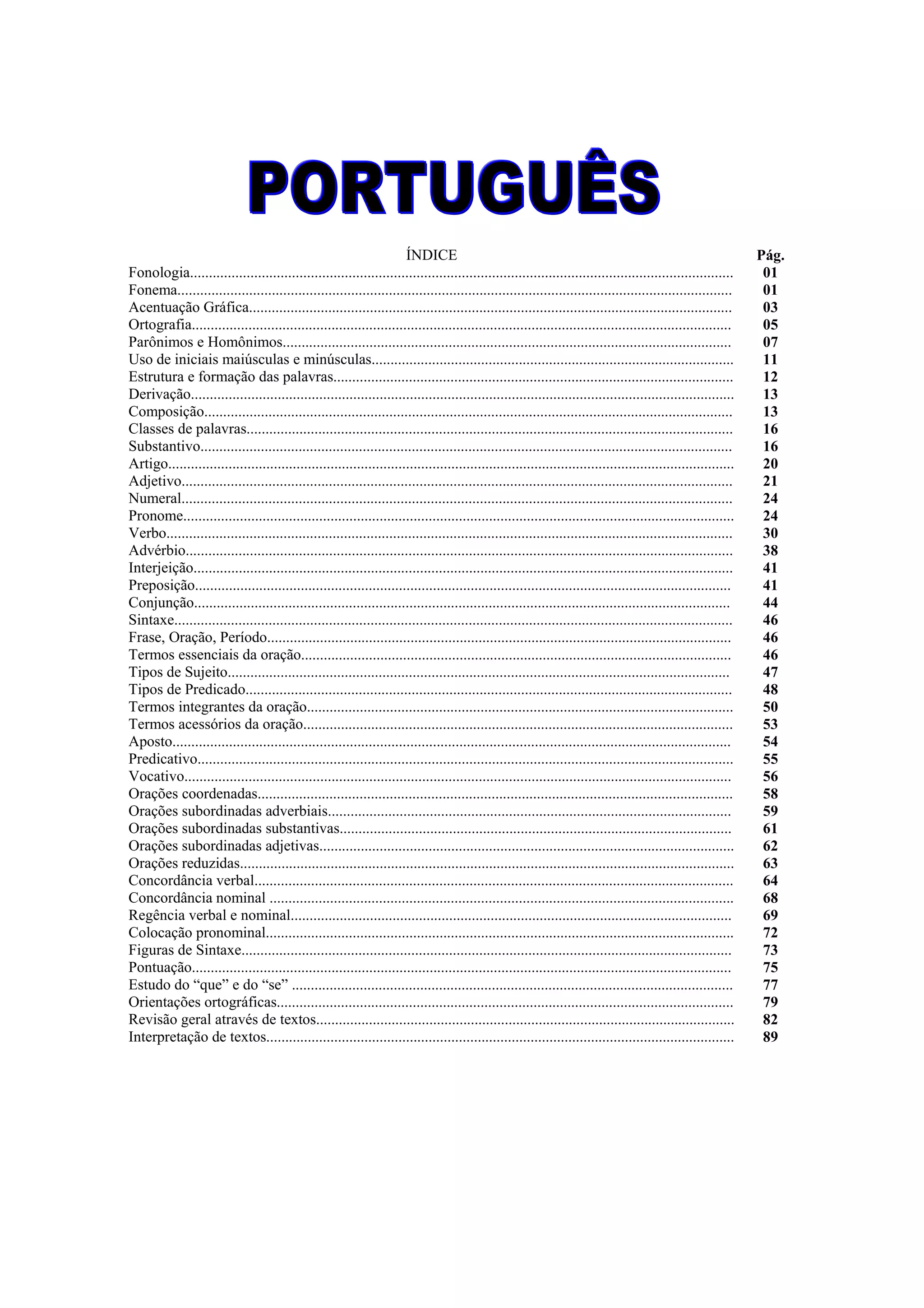 1) O documento apresenta os principais tópicos da fonologia, ortografia e sintaxe da língua portuguesa, incluindo fonemas, acentuação, classes de palavras e estrutura da oração.