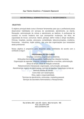 Este documento fornece um resumo sobre o curso de Secretária Administrativa e Recepcionista. Ele descreve o objetivo do curso de desenvolver habilidades essenciais como atendimento ao cliente, organização e comunicação. Também apresenta a programação do curso, incluindo tópicos como empresa, atribuições da secretária e ética profissional.