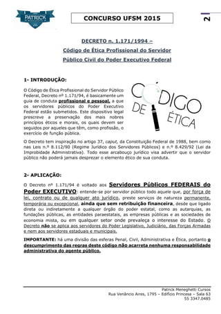 O documento descreve um código de ética para servidores públicos federais. Ele estabelece regras de conduta profissional e pessoal como dignidade, decoro, zelo, moralidade e eficiência. Também requer que os atos dos servidores sejam direcionados para a preservação da honra e tradição dos serviços públicos.