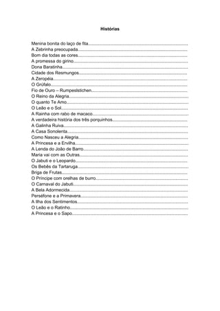 Este documento apresenta várias histórias infantis brasileiras em português. As histórias variam em tema e enredo, mas geralmente ensinam lições de vida ou valores como amizade e aceitação pessoal. Algumas das histórias incluídas são "Menina Bonita do Laço de Fita", "A Zebrinha Preocupada" e "Bom Dia, Todas as Cores".