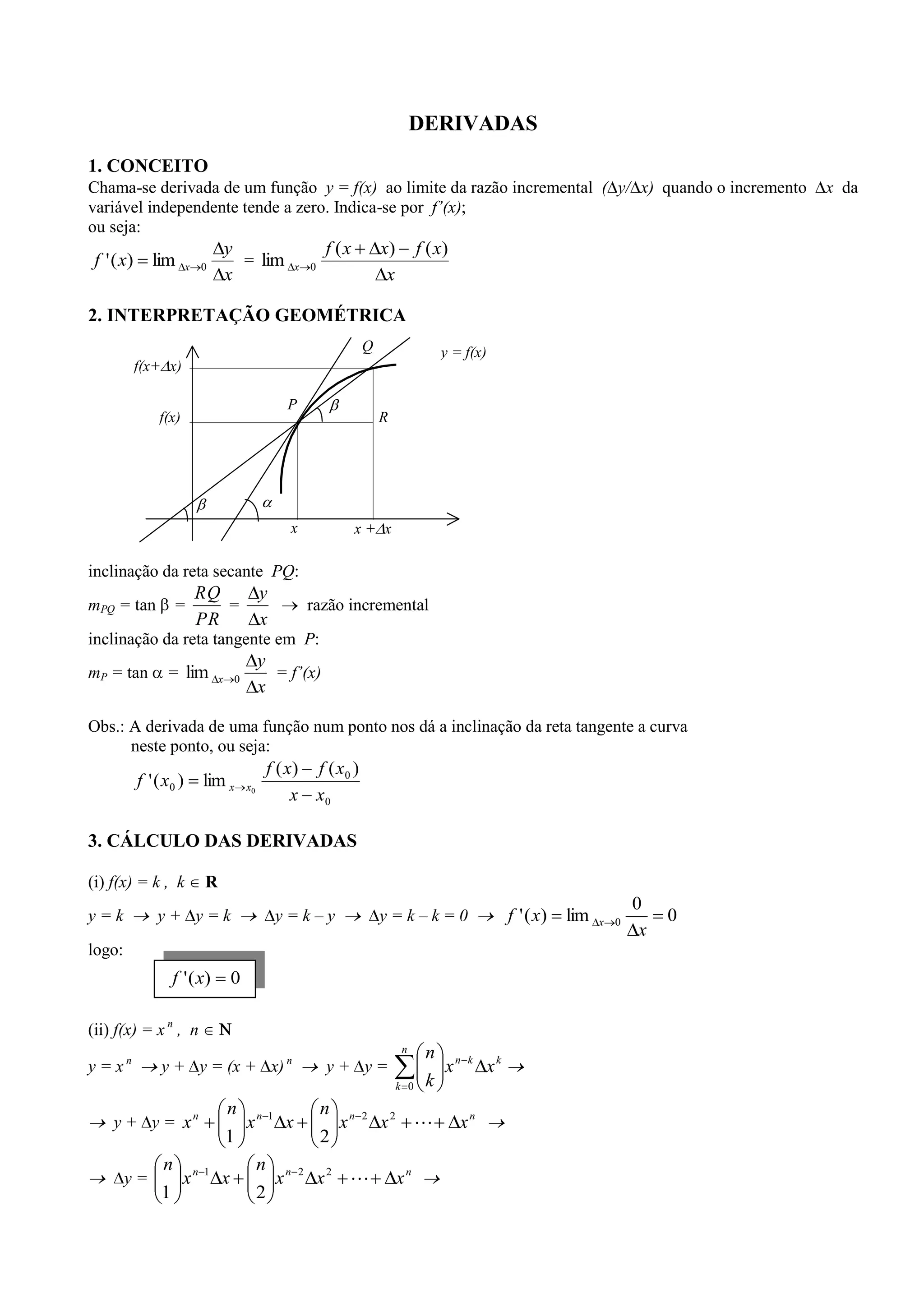 2. Exemplos de cálculo de derivadas incluem f'(x)=0 para f(x)=k, f'(x)=n.xn-1 para f(x)=xn e f'(x)=cos(x) para f(x)=sen(x).