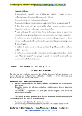 O documento discute vários tópicos relacionados à didática e métodos de ensino, incluindo: 1) teorias sobre como os alunos aprendem (empirismo vs construtivismo); 2) objetivos de ensino gerais e específicos; 3) tipos de conteúdos (fatuais, conceituais, procedimentais, atitudinais); 4) métodos de ensino como exposição, trabalho independente, elaboração conjunta e trabalho em grupo.