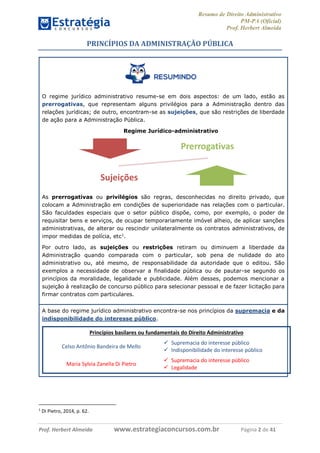 O documento apresenta um resumo sobre Direito Administrativo para o concurso de Oficial da Polícia Militar do Pará, abordando tópicos como princípios da administração pública, organização administrativa, atos administrativos e agentes públicos. O resumo destaca os princípios expressos na Constituição Federal - legalidade, impessoalidade, moralidade, publicidade e eficiência - e outros princípios implícitos como supremacia e indisponibilidade do interesse público.