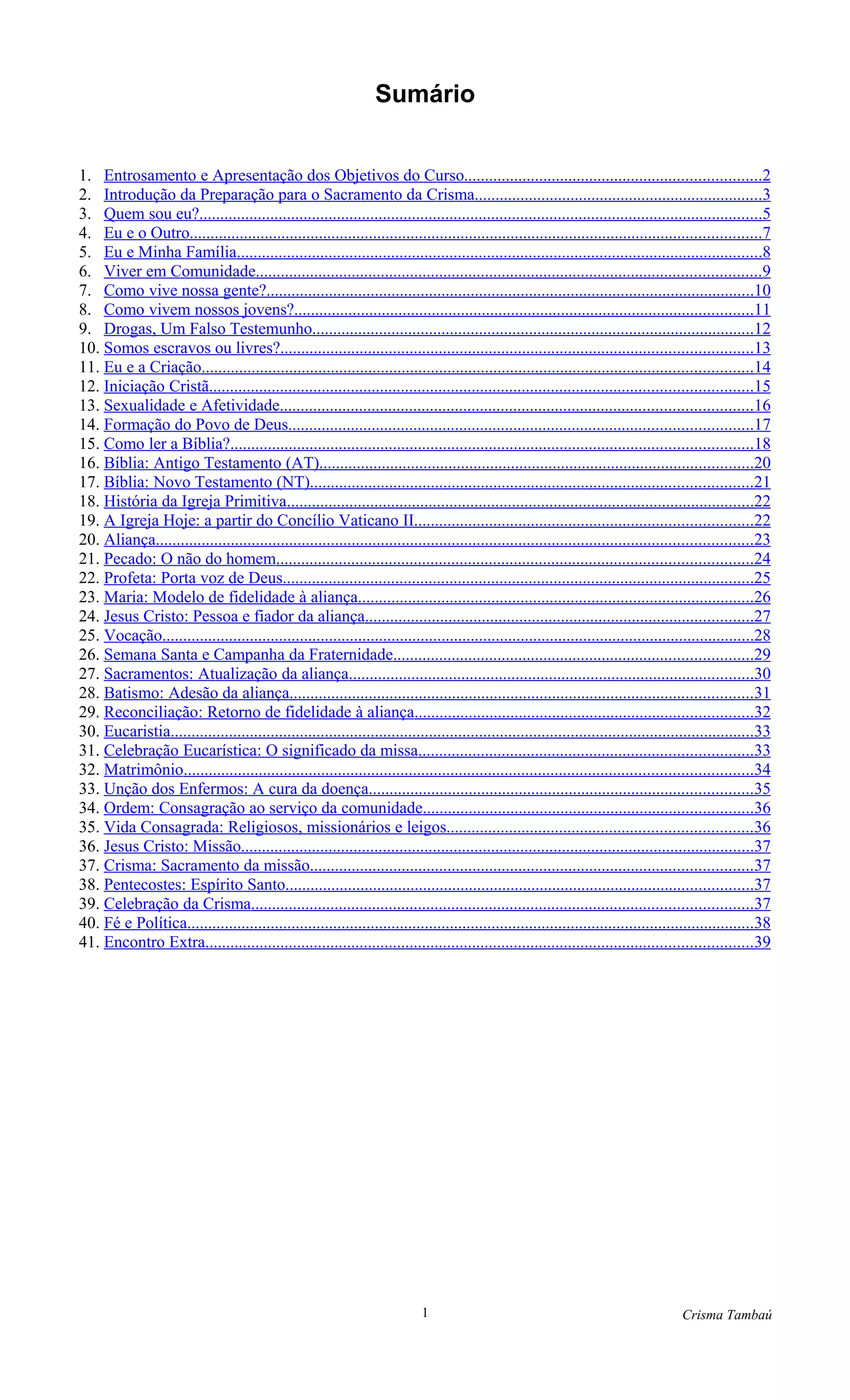 Este documento apresenta um plano de aula para um curso de preparação para o sacramento da crisma. Ele inclui objetivos, orações, dinâmicas de grupo e discussões sobre tópicos como identidade pessoal, família, comunidade e como vive a humanidade. O documento fornece uma estrutura detalhada para explorar essas questões espirituais e sociais com os estudantes.