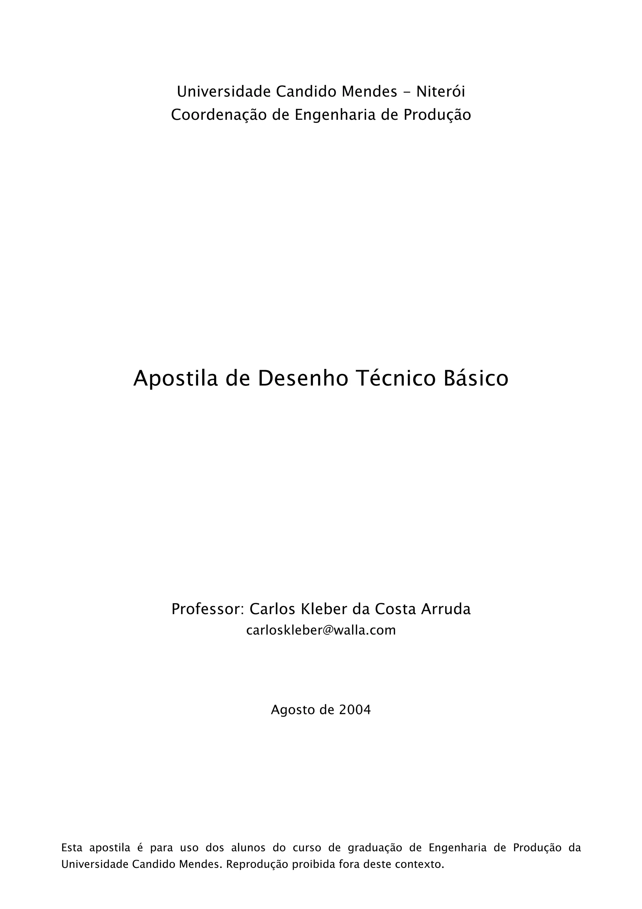 Este documento é uma apostila sobre desenho técnico básico produzida pela Universidade Cândido Mendes para os alunos de engenharia de produção. A apostila introduz conceitos como instrumentos de desenho, normas, construções geométricas e convenções para desenhos técnicos.
