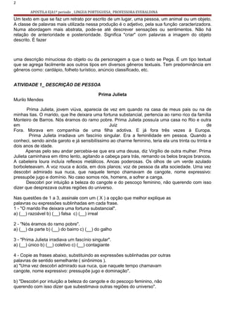 O documento descreve os principais tipos textuais e fornece exemplos de cada um. São eles: 1) Descrição, 2) Narração, 3) Dissertação (argumentação e exposição), 4) Injunção/Instrucional, 5) Dialogal/Conversacional e 6) Poético. Além disso, fornece uma atividade sobre descrição de pessoa e elementos da narração.