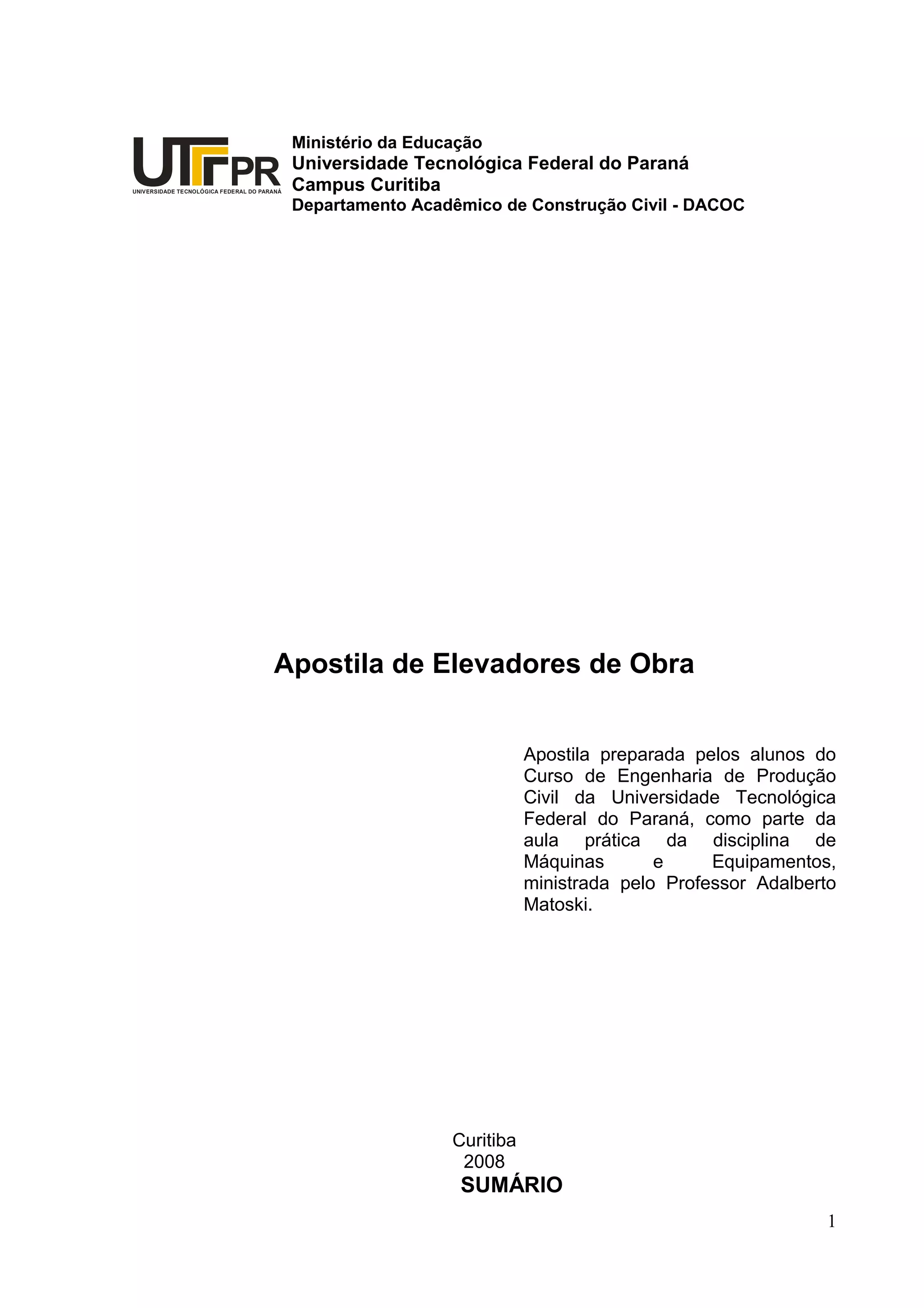 1. O documento descreve uma apostila sobre elevadores de obra produzida por alunos de engenharia civil da Universidade Tecnológica Federal do Paraná.