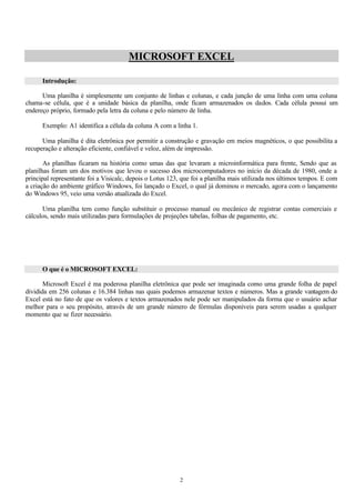 O documento descreve as principais funcionalidades do Microsoft Excel, incluindo: (1) O que é uma planilha eletrônica e suas principais características; (2) Os elementos da tela do Excel como barras de menus, ferramentas e a janela da planilha; (3) Como inserir e alterar conteúdo em células, alterar formatação de texto, largura de colunas e altura de linhas.
