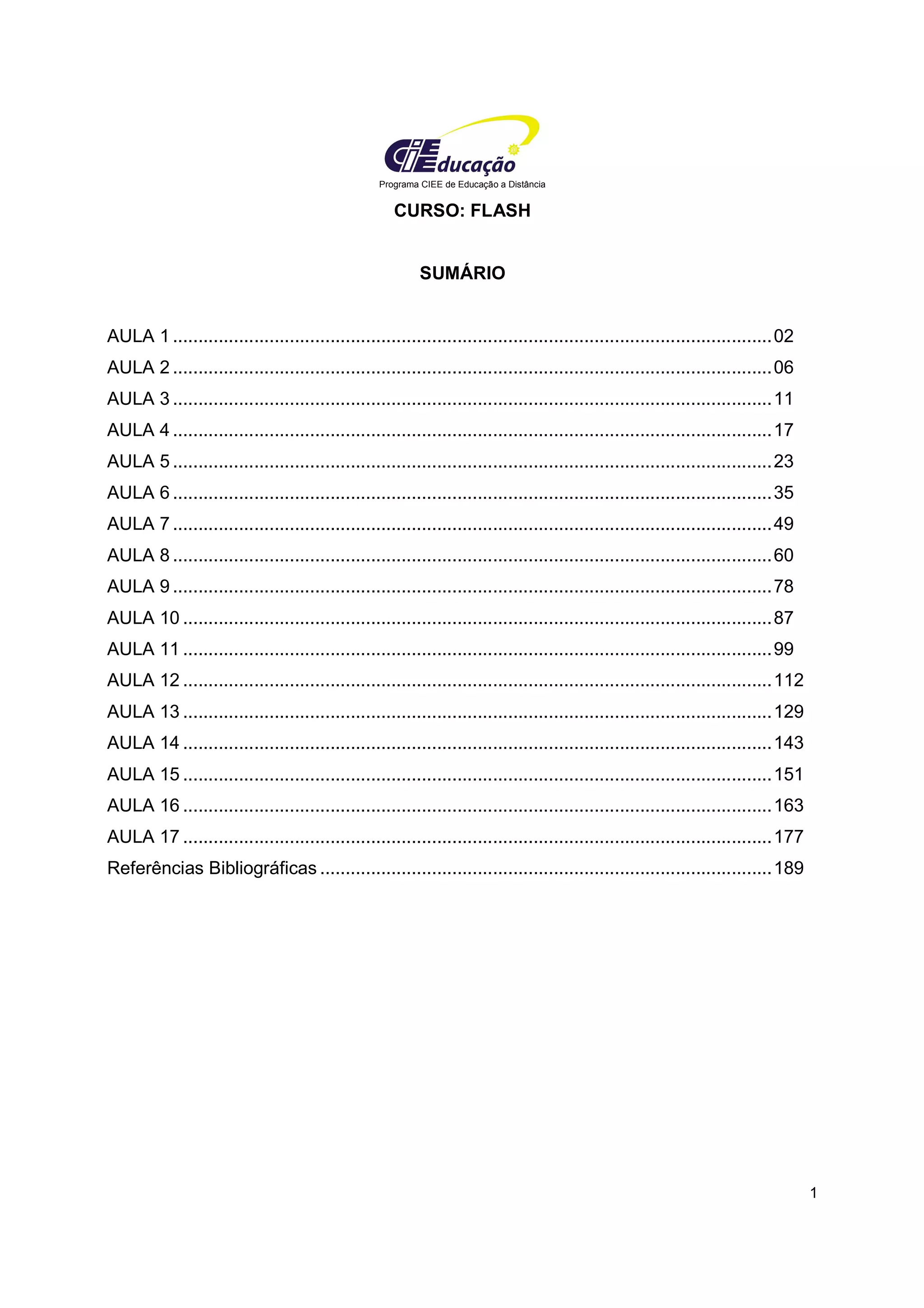 O documento descreve as principais ferramentas e recursos do programa Flash, incluindo o palco, linhas do tempo, camadas, cenas, animação, arte, interatividade e desenvolvimento de aplicativos. É dividido em 17 aulas que abordam tópicos como interface do usuário, animação, importação de artes, scripts e publicação.