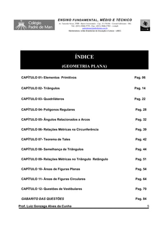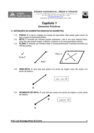 O documento apresenta um capítulo sobre elementos primitivos da geometria plana, definindo pontos, retas, planos, semi-retas, segmentos de reta e ângulos. Inclui também definições de ângulos retos, agudos, obtusos, complementares, suplementares e replamentares. Por fim, apresenta exercícios de fixação sobre esses conceitos.
