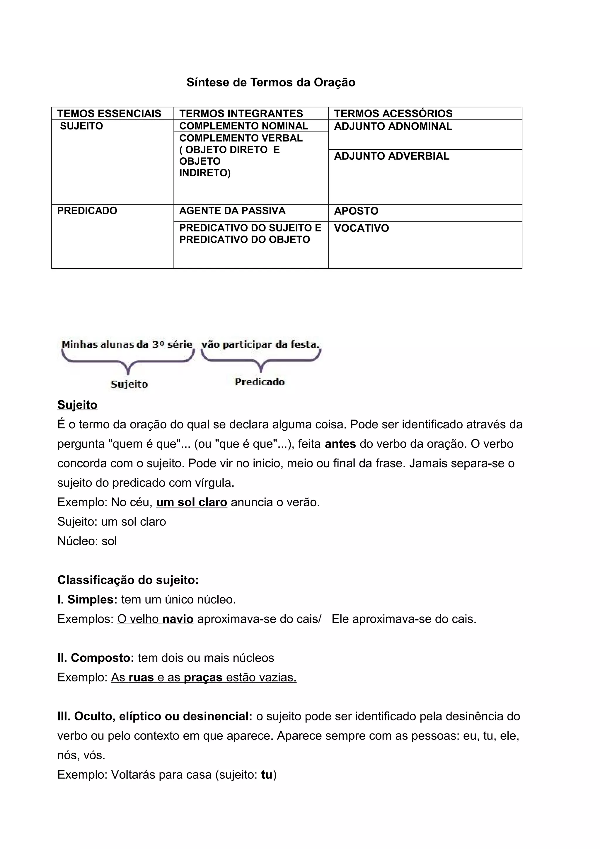 1) O documento fornece uma síntese dos principais termos da oração, incluindo sujeito, predicado, complementos e adjuntos.