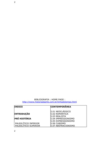 Este documento fornece um resumo da história da arte, desde a pré-história até a arte contemporânea, dividido por períodos históricos. Aborda estilos artísticos como paleolítico, neolítico, arte antiga egípcia e romana, idade média, renascimento, entre outros. Também discute conceitos como função da arte, como entender obras de arte e como as ideias se espalham pelo mundo.