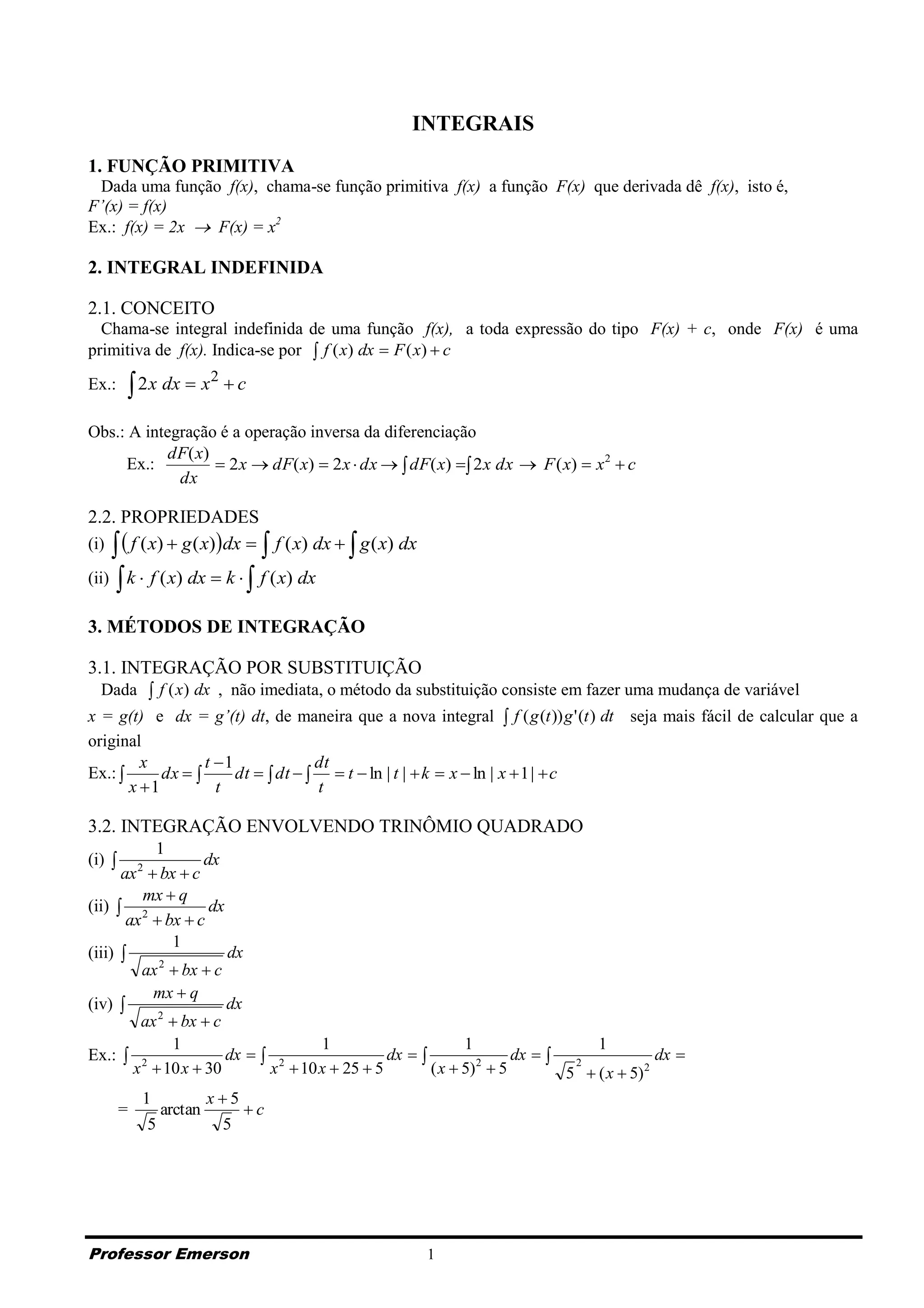 1) O documento discute conceitos fundamentais de integrais, incluindo função primitiva, integral indefinida, métodos de integração como substituição e por partes, e aplicações como cálculo de áreas e volumes.