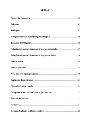 Este documento apresenta os principais conceitos de geometria fundamental para engenharia, incluindo: (1) definições de polígonos, triângulos e suas classificações; (2) o Teorema de Pitágoras e suas aplicações; (3) relações trigonométricas em triângulos retângulos e não retângulos usando seno, cosseno e tangente; (4) leis dos senos e cossenos; e (5) cálculos de área e volume de figuras geométricas comuns. O documento fornece