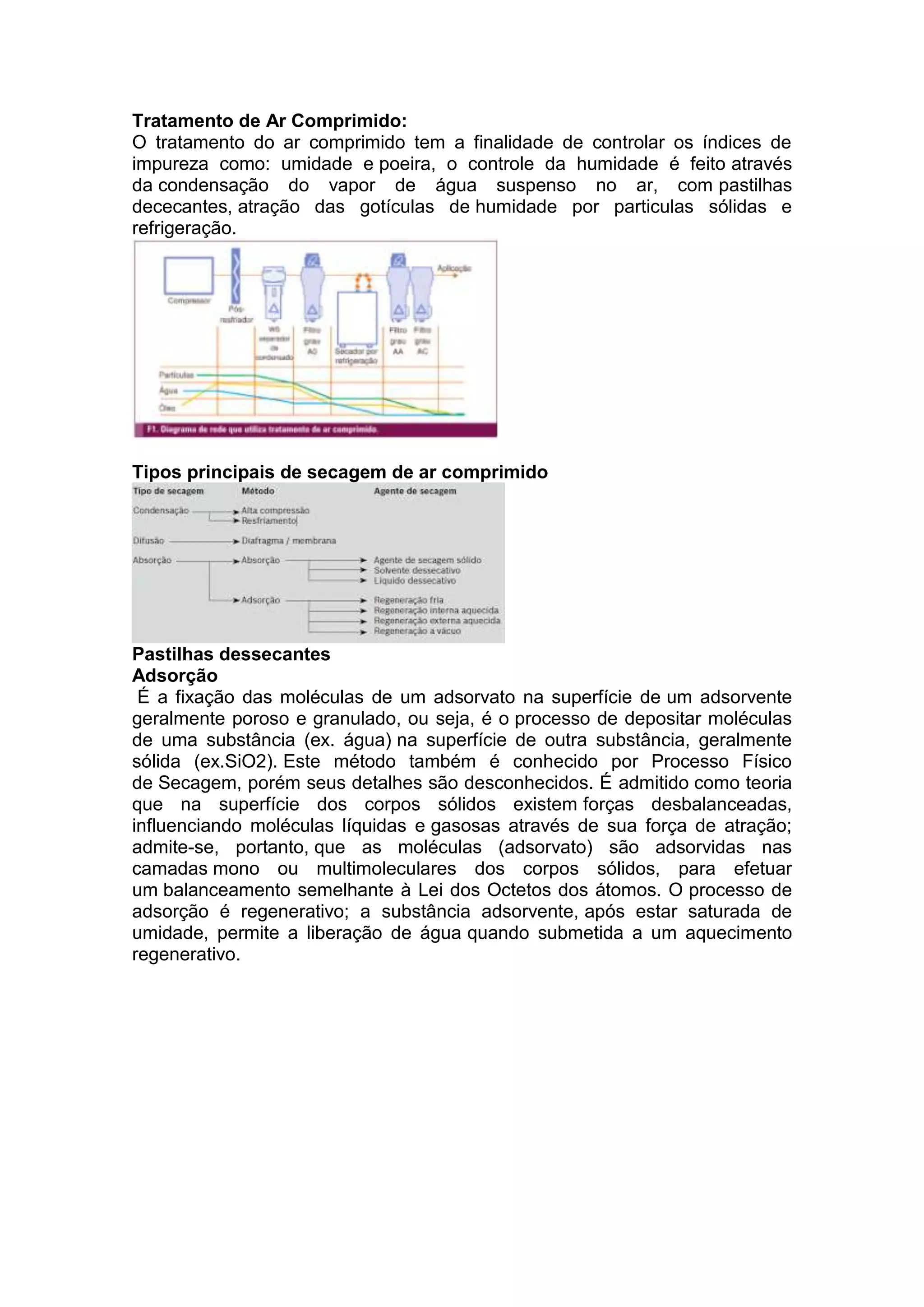 1) O documento descreve diferentes métodos para tratar ar comprimido, incluindo pastilhas dessecantes, adsorção, absorção e resfriamento.