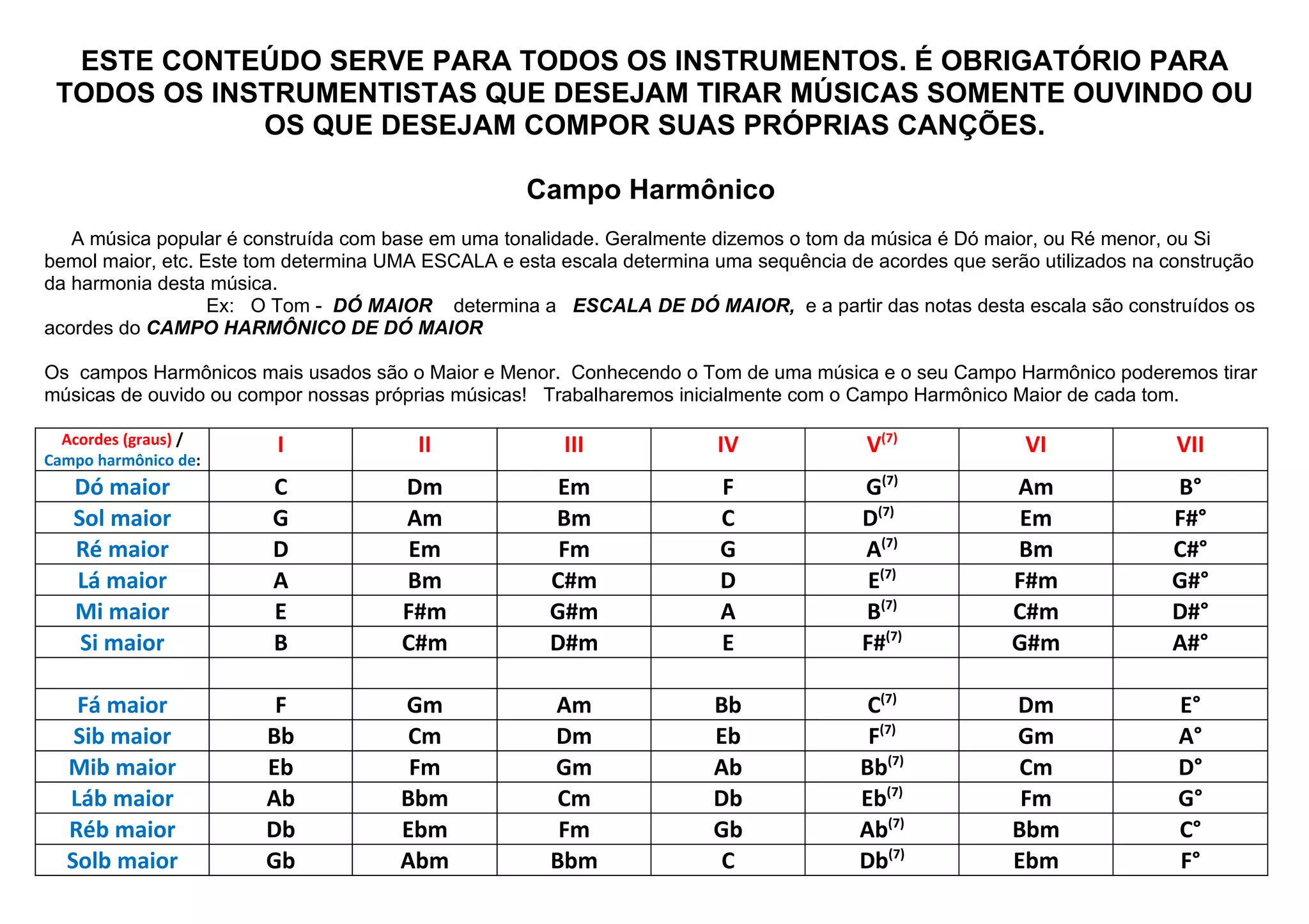 1) O documento explica os campos harmônicos maiores, que determinam a sequência de acordes em uma tonalidade.